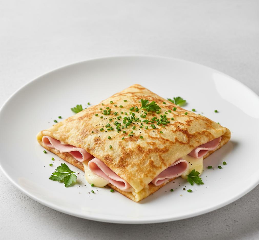 Crêpe fine et moelleuse garnie de tranches de jambon frais, légèrement grillé pour un goût tendre et savoureux. Idéal pour un déjeuner rapide ou un encas gourmand.