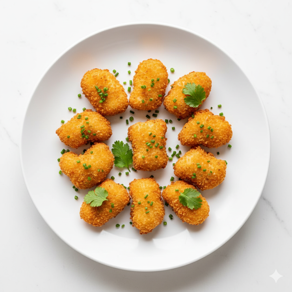 Petits morceaux de poulet panés et frits à la perfection, dorés et croustillants, servis avec une sauce de votre choix.