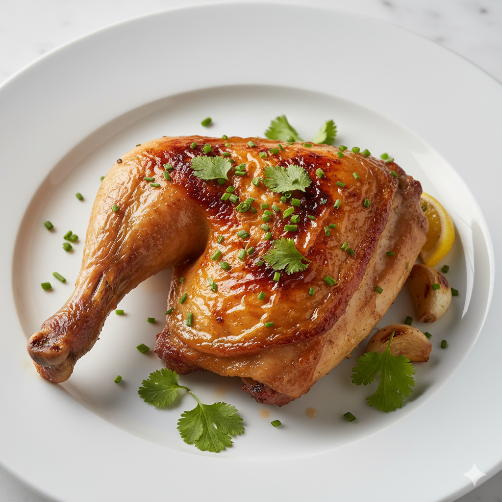 Poulet rôti entier ou en morceaux, parfumé avec des herbes et épices locales.