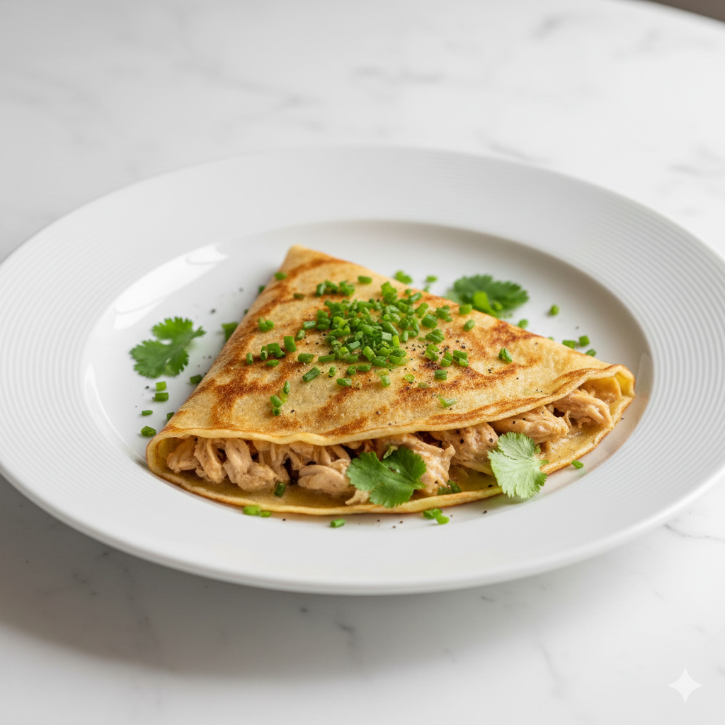Crêpe délicate avec morceaux de poulet grillé, assaisonnés aux épices locales.