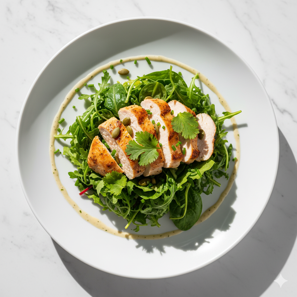Salade composée avec morceaux de poulet grillé, légumes frais et vinaigrette maison.