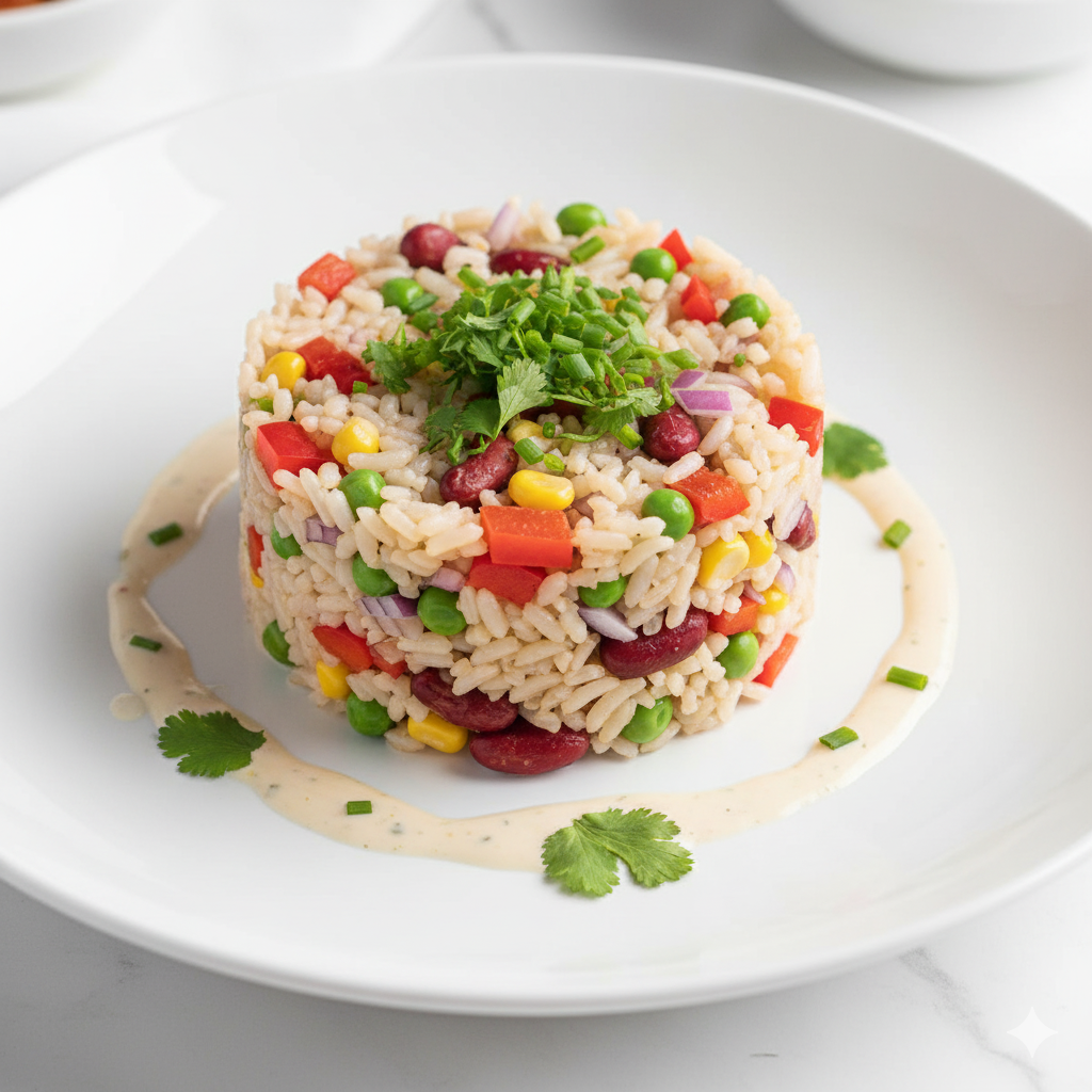 Salade de riz froid avec légumes variés et assaisonnement savoureux, idéale pour un repas léger.