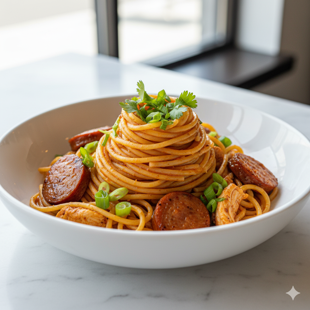 Spaghetti avec sauce tomate maison et épices locales, un classique simple et savoureux pour le petit-déjeuner ou le brunch.