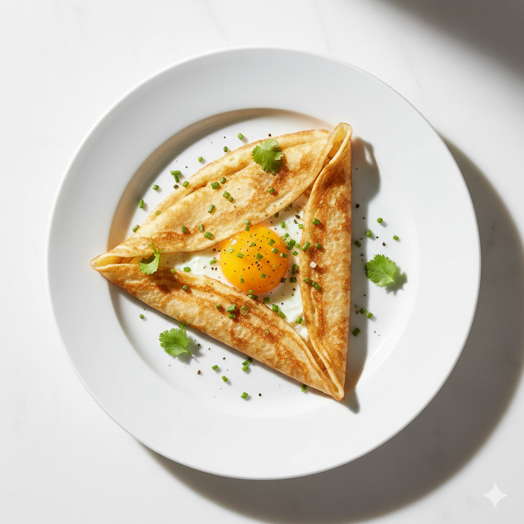 Crêpe simple et nourrissante garnie d'œuf frit, idéale pour le petit-déjeuner ou un brunch rapide.