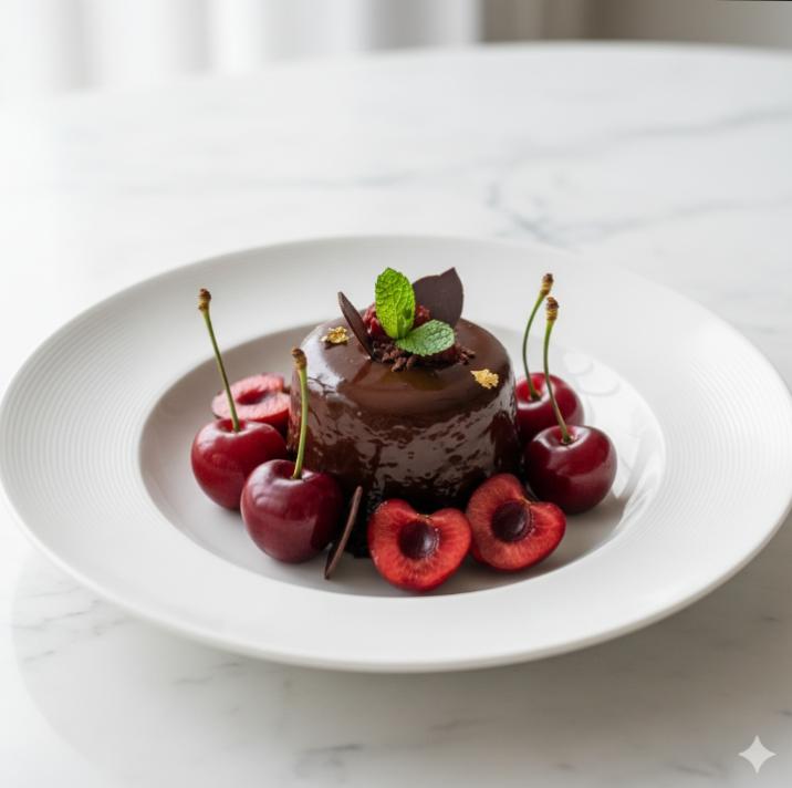 Gâteau au chocolat intense avec des morceaux de cerise, un mélange sucré et acidulé irrésistible.