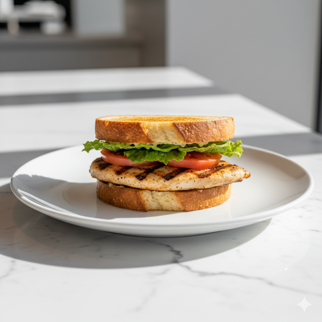 Sandwich généreux avec des morceaux de poulet grillé, accompagnés de légumes frais et d'une sauce maison légèrement épicée. Parfait pour un repas rapide et savoureux.