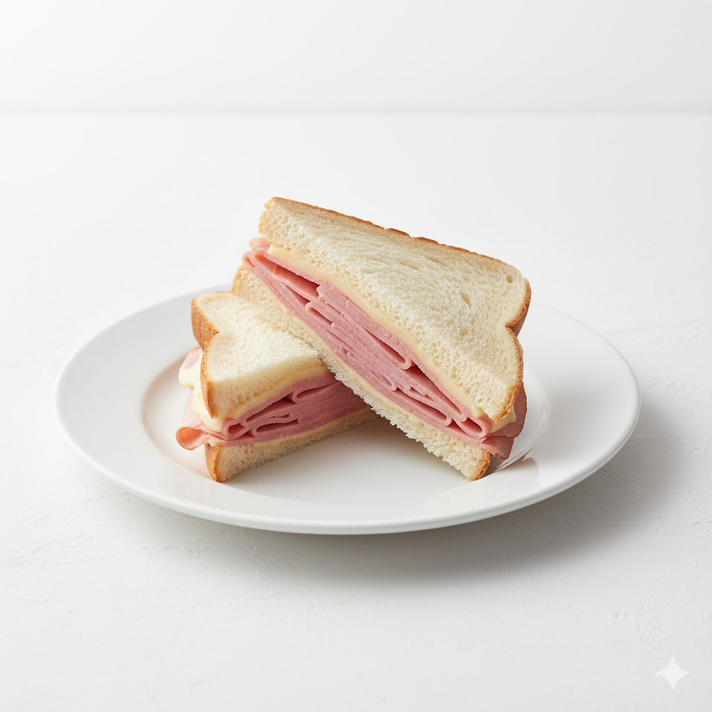 Sandwich classique avec jambon tendre et fromage fondant, légèrement toasté pour un goût riche et gourmand.